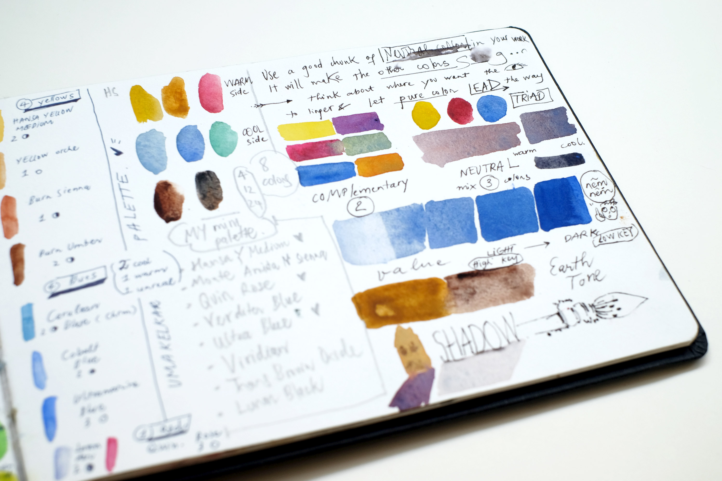 Bảng màu đi vẽ thường từ 9 tới 12 màu. Việc giới hạn và hiểu kĩ bảng màu giúp mình chọn gam và pha màu nhanh hơn, ưu tiên cho việc tìm được sắc độ và nhịp độ mong muốn – hai điểm cần để ý hơn nhiều để vẽ được tốt hơn.