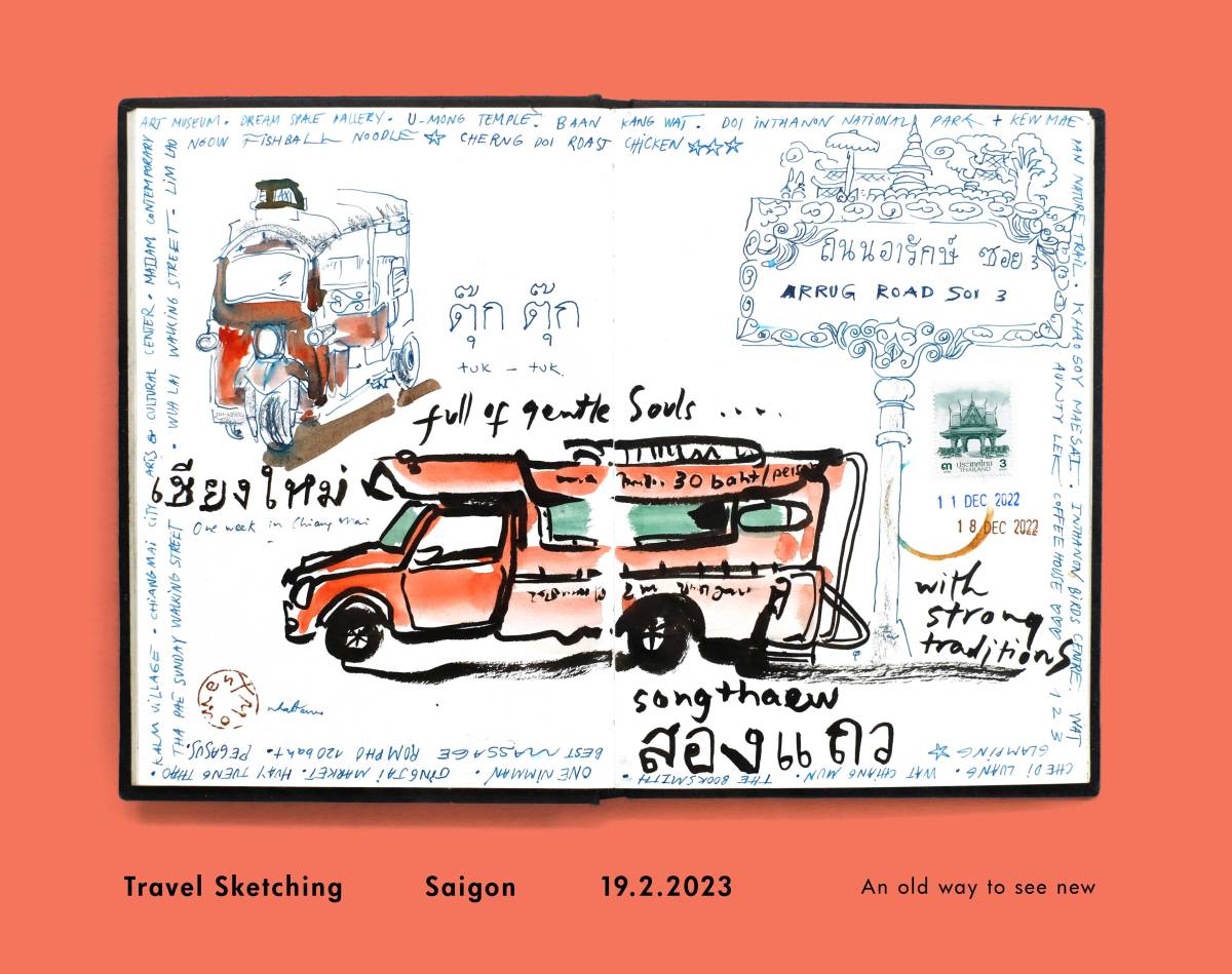 Cảm hứng bắt nguồn từ chuyến đi một tuần ở Chiang Mai, workshop ra đời để chia sẻ về cách vừa đi vừa vẽ. Với cuốn sổ và cây bút, bằng thời gian đợi một chuyến xe hay một cốc cafe, bạn cùng lúc vẽ, viết và gói lại những khoảnh khắc của hành trình.